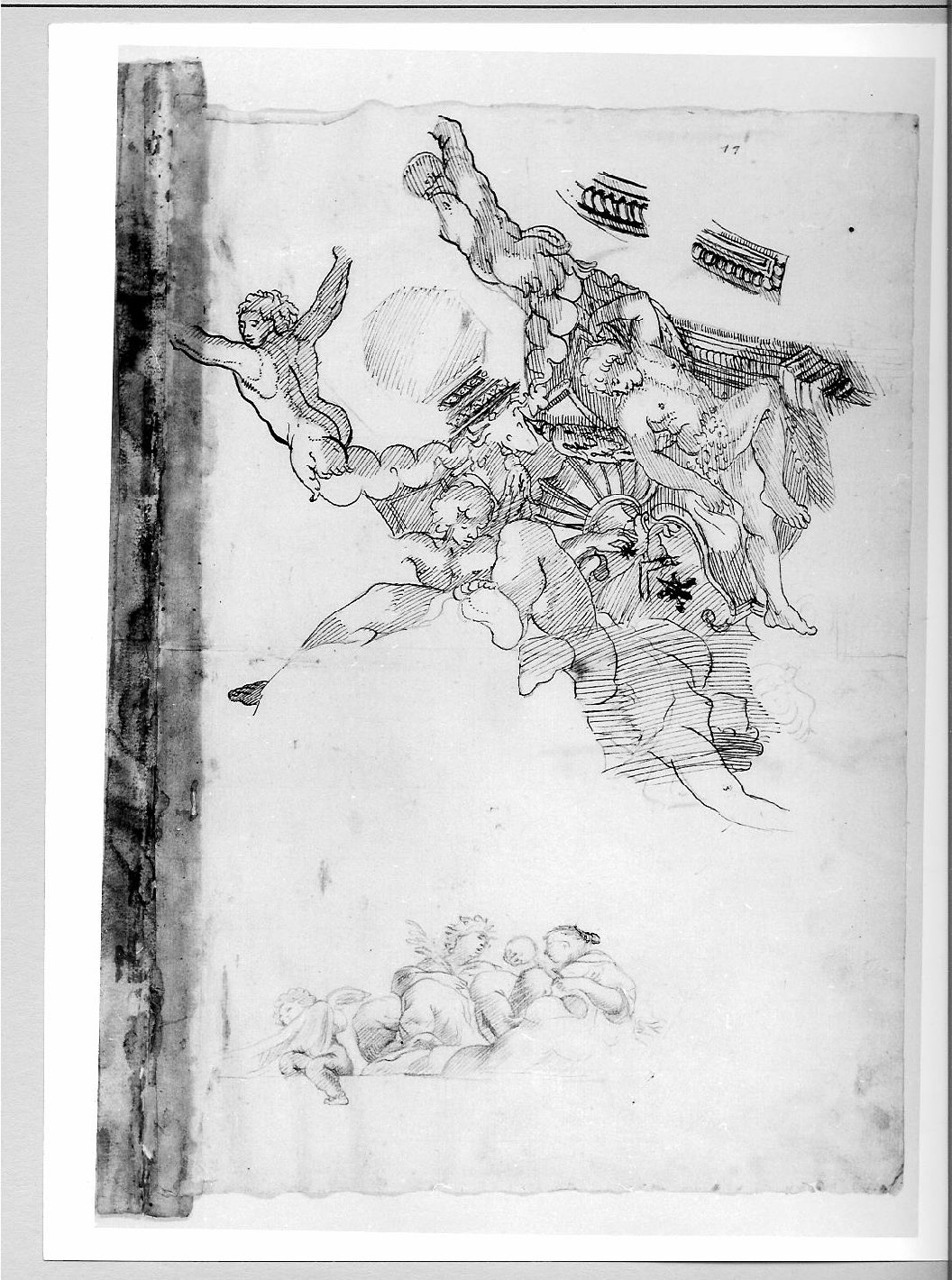 - NOTIZIE STORICO CRITICHE Sulla parte alta del foglio è disegnata a penna e inchiostro un frammento, visto dal basso, di una cornice con al centro uno stemma (giglio stilizzato) accompaganto da ignudi e un gigante sdraiato; sulla parte bassa del foglio sono disegnate a matita due donne sedute su tavole con una palma e un globo in mano accanto un putto. Si tratta di una copia di due particolari dell'affresco di Pietro da Cortona nel Salone di Palazzo Barberini. Il primo dettaglio riprende, con varianti, la parte sottostante il medaglione con la raffigurazione della contenenza di Scipione. (cfr. G. Briganti, Pietro da Cortona, fig. 125). Il secondo dettaglio riprende le virtù nel riquadro centrale. La copia fu eseguita sulla base di incisioni secondo quanto risulta dal taglio della composizione e soprattutto dall'esecuzione a tratteggio (di qualità assai scadente), corrisponde all'incisione dello stesso particolare pubblicata nell'Aedes Barberinae" di G. Tetius, Romae, 1642, excudebat Mascardus, p. 46/4