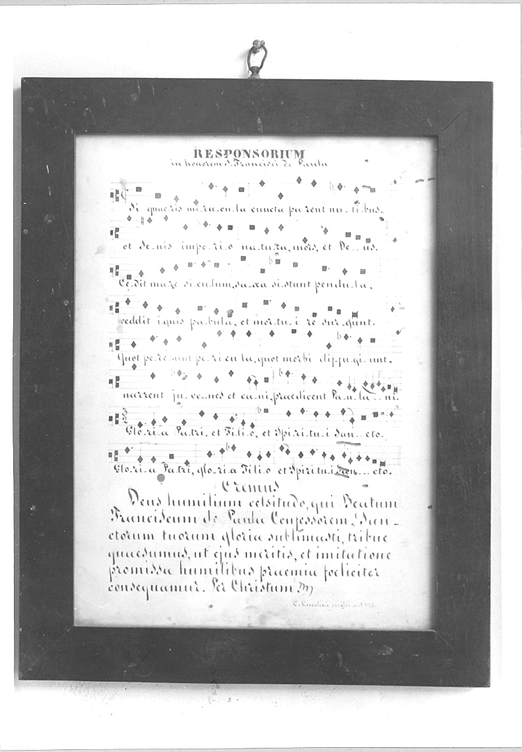 - NOTIZIE STORICO CRITICHE Cornice contenente foglio manoscritto del Responsorium in honorem S. Francisci di Paula