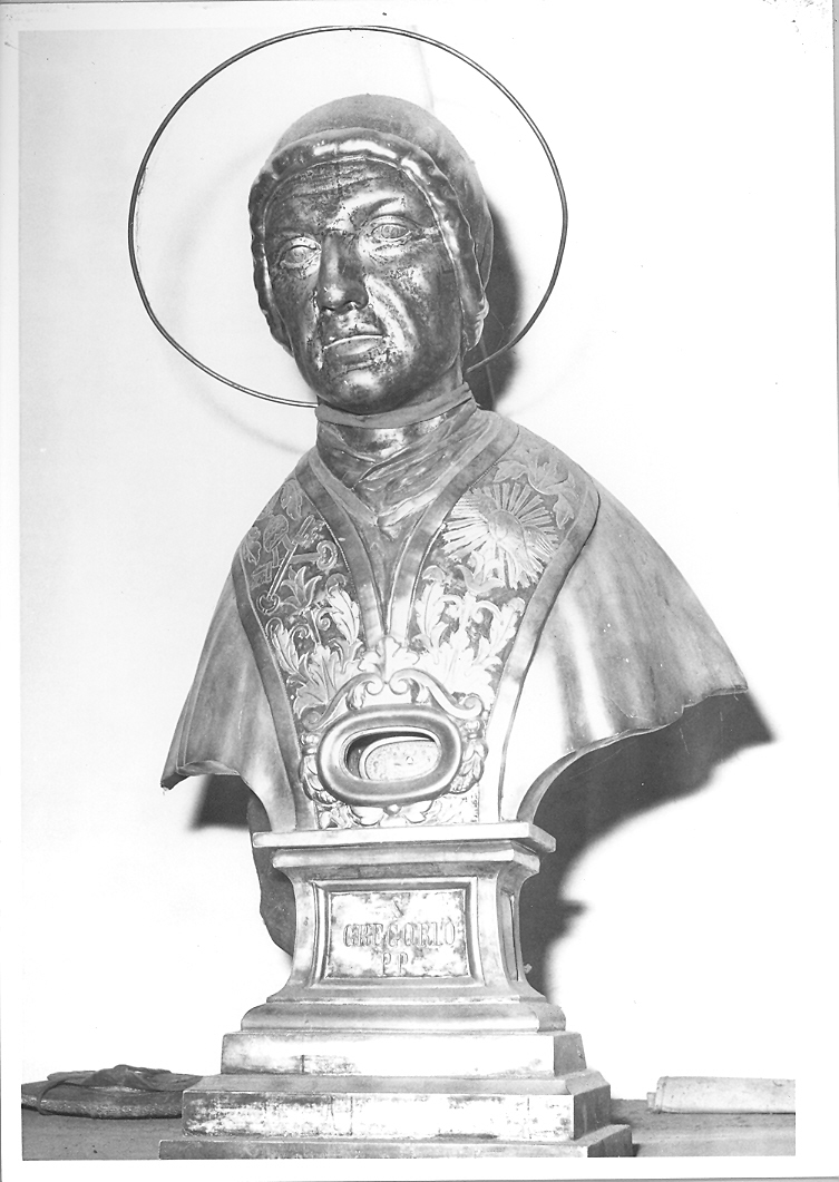 La scultura si sviluppa sopra un supporto rettangolare nel cui specchio fontale è incisa una scritta. Sul petto bel busto è l'ovale con la teca pe le reliquie