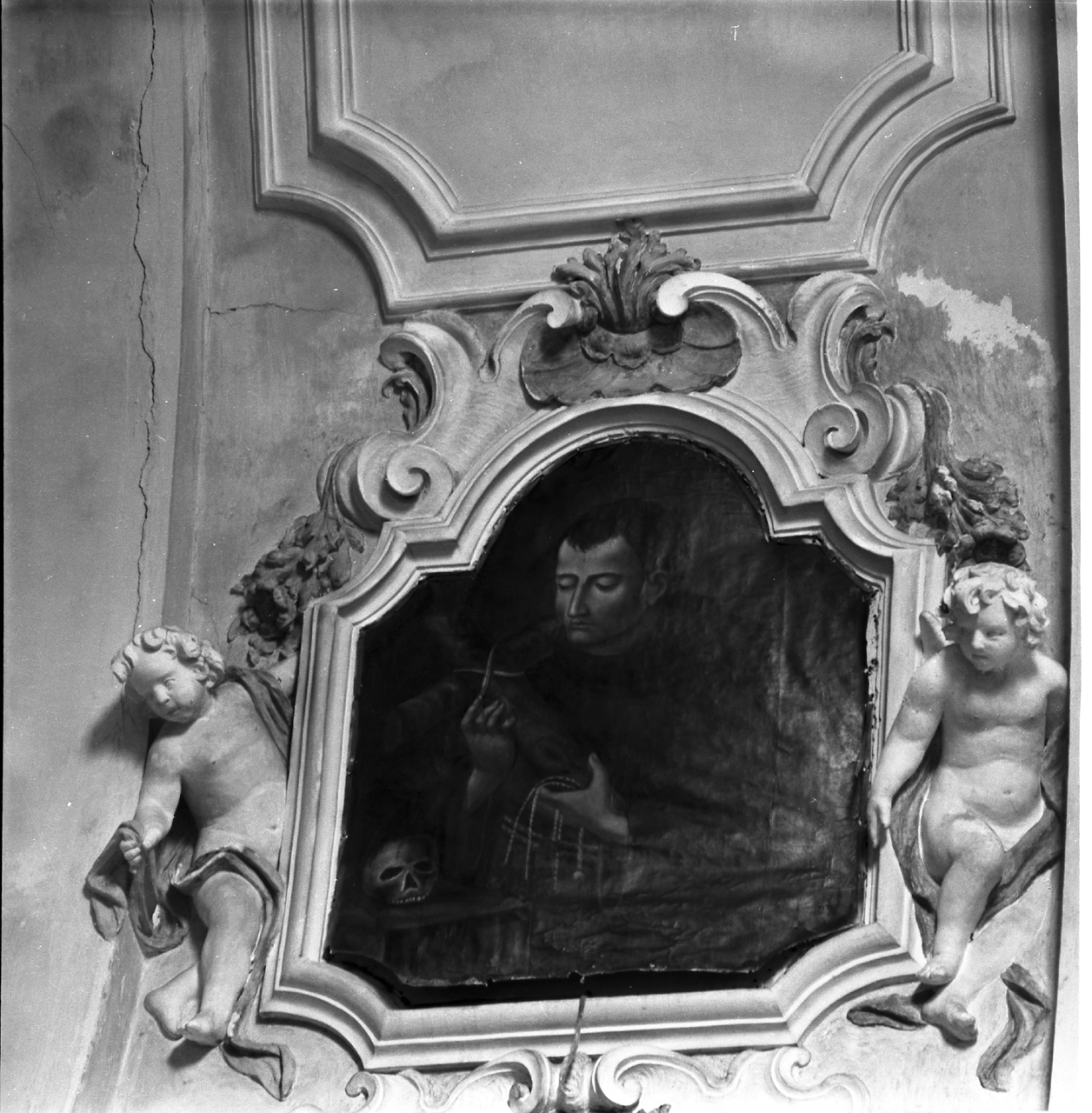 - NOTIZIE STORICO CRITICHE La tela appartiene ad una serie di otto dipinti che ornavano la volta a botte della navata, disponendosi tra le finestre situate all'attacco della cornice marcapiano della chiesa. Attualmente solo due di essi sono rimasti in situ, mentre degli altri sei, ora in deposito presso la Collegiata di S. Medardo, rimangono le incorniciature ovali e mistilinee sorrette da angioletti in volo modellati in stucco. I dipinti furono probabilmente eseguiti dal medesimo autore all'epoca della ristrutturazione e del riallestimento decorativo a stucco dell'interno dell'aula, avvenuto intorno alla metà del XVIII secolo. La figura di frate francescano rappresentata nella tela può essere identificata, per gli attributi di penitenza ed anacoretismo, con il Beato Filippo da Velletri, vissuto nel XVIII secolo