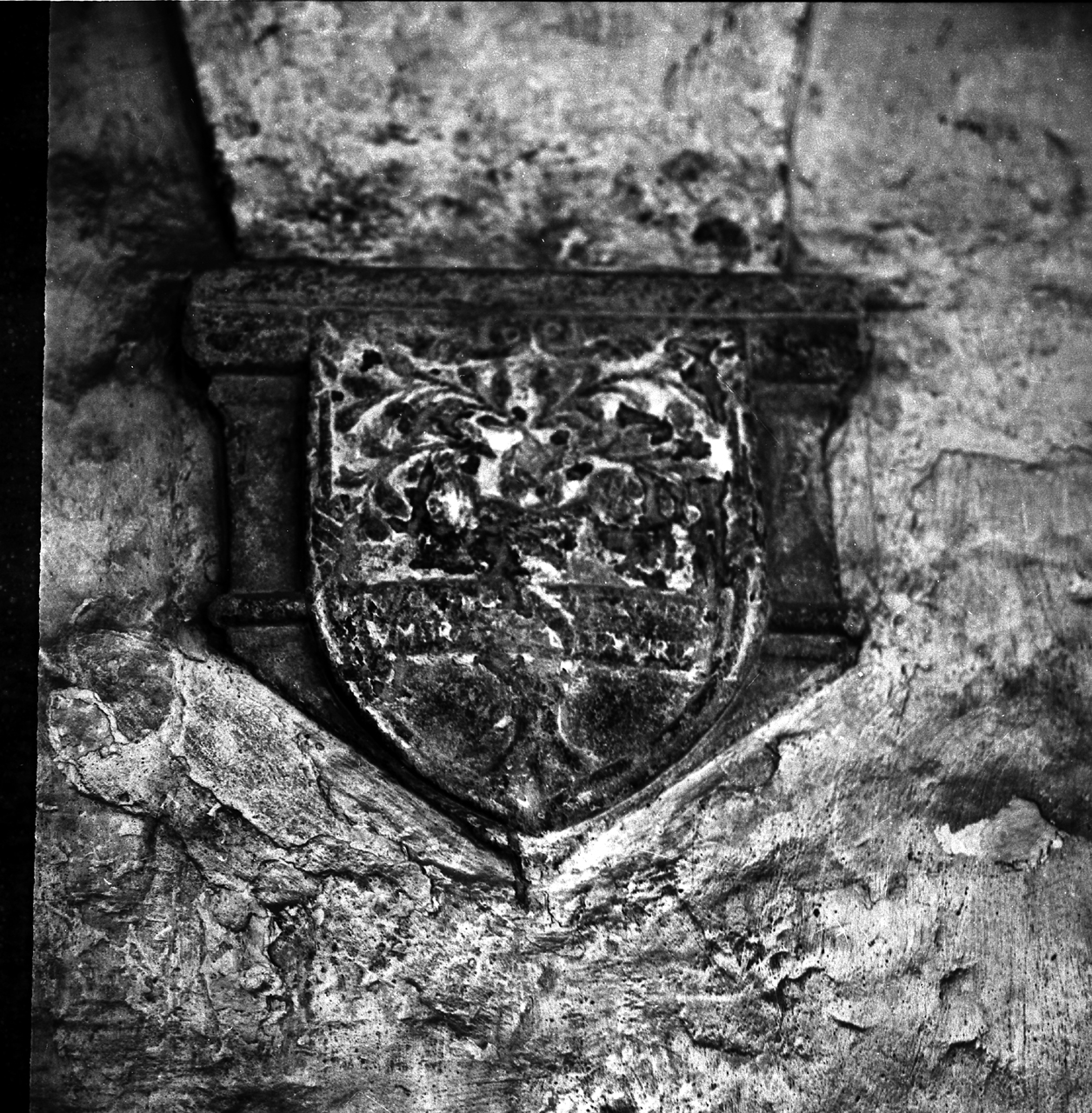 - NOTIZIE STORICO CRITICHE Lo stemma, di difficile identificazione, è scolpito su uno dei peducci alla base delle volte a crociera del portico del chiostro francescano. Il loggiato ad impianto rettangolare è scandito da arcate a pieno centro poggianti su pilastri in laterizio. Tale parte del convento conserva ancora le semplici linee originarie (P. Santini, 1984), risalenti probabilmente ai lavori di chiusura della facciata della chiesa adiacente, effettuati nel corso del XV secolo. Gli altri peducci del portico non presentano particolari decorazioni a rilievo, essendo intagliati a semplici scanalature verticali, tranne quello con l'emblema dell'ordine francescano, situato in prossimità del corridoio di ingresso all'ex complesso monastico