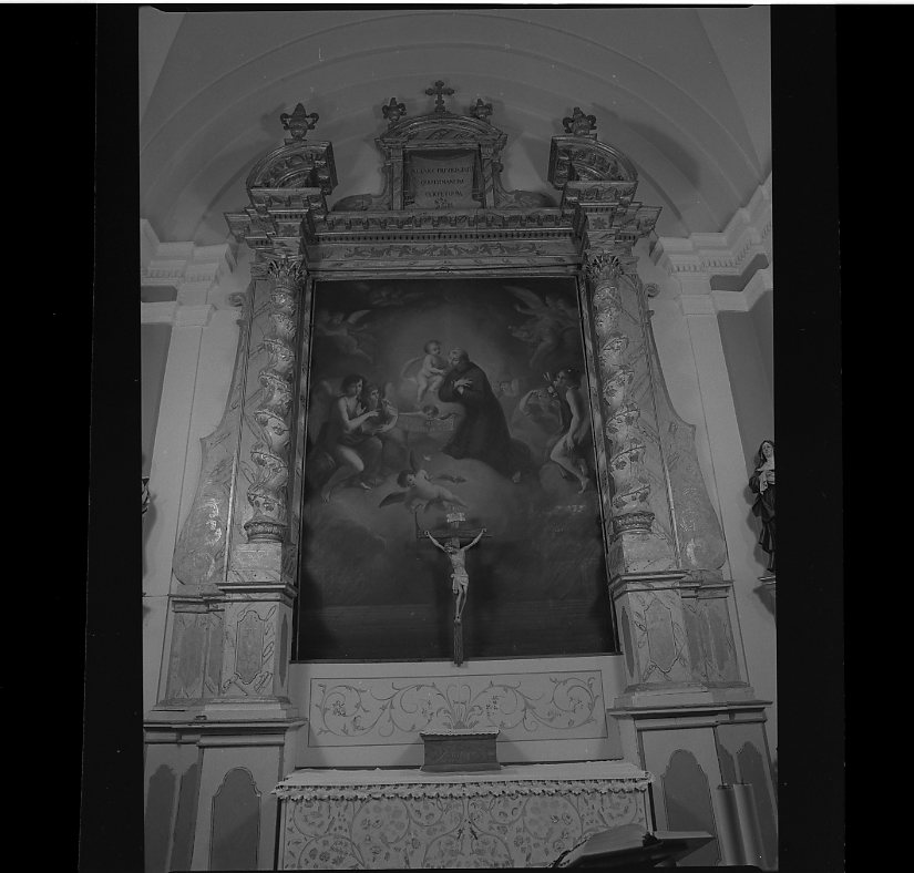 Ancona a due tortiglioni sorreggenti un architrave ornata da piccole mensole, sulla quale poggiano una cimasa a frontone curvo, con croce e due vasi ornamentali e, in corrispondenza dei tortiglioni, i due angoli del frontone interrotto, anch'essi lavorati a mensoline e sormontati da vasi ornamentali. Cimasa e tortiglioni sono affiancati da laterali a ricci dipinti. I fondi sono bianchi, con decorazioni a finti marmi; le parti a rilievo sono dorate; cartelle e decorazioni sono color verdognolo