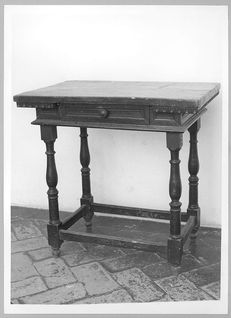 Tavolinetto rifinito nei bordi sottostanti il piano di base, a un cassetto e con gambe tornite a fuselli unite da traverse