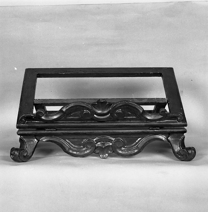 Su peducci a ricciolo, il leggio, a doppia fronte profilata da volute che si raccordano al centro in una foglia stilizzata, è in legno dorato