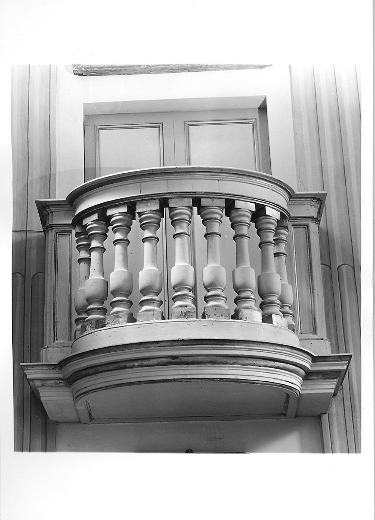 Nove colonnine lignee dipinte, disposte a semicerchio, su basamento evidenziato da cornici dorate in rilievo reggono il corniccione superiore, fiancheggiato da paraste di legno con cornicine interne dorate