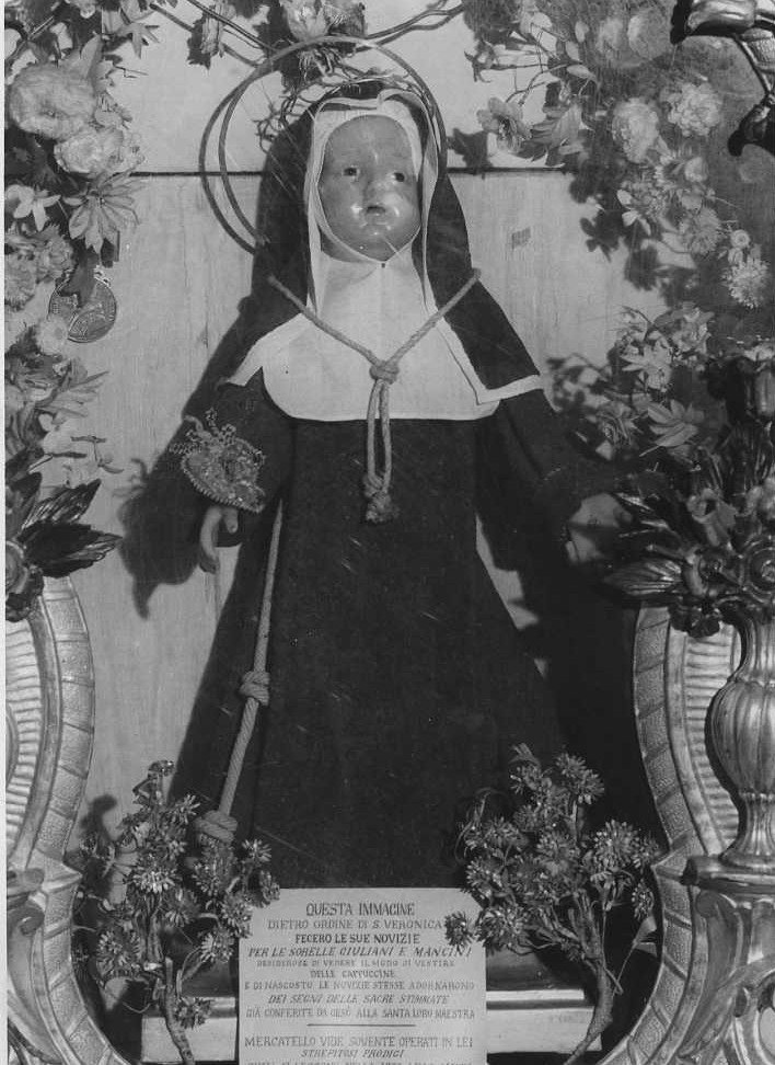 - NOTIZIE STORICO CRITICHE La statuetta risale agli anni immediatamente successivi al 1697, anno in cui Santa Veronica, ricevette le stimmate. La sua creazione è dovuta ad un singolare episodio: tre delle sorelle di Veronica, entrate nel monastero di Mercatello, volendo vedere come erano vestite le cappuccine di Città di Castello, chiesero più volte a Veronica di mandar loro una "pupazza" vestita da cappuccina. Veronica esaudì il loro desiderio, ma le sue novizie, per fare una burla alla loro maestra, aggiunsero nelle mani, nei piedi e nel costato del pupazzo i segni delle stigmate. La statuetta è venerata oggi per i miracoli che compì nel secolo XVIII, ed è conservata in un'urna di fabbricazione più recente
