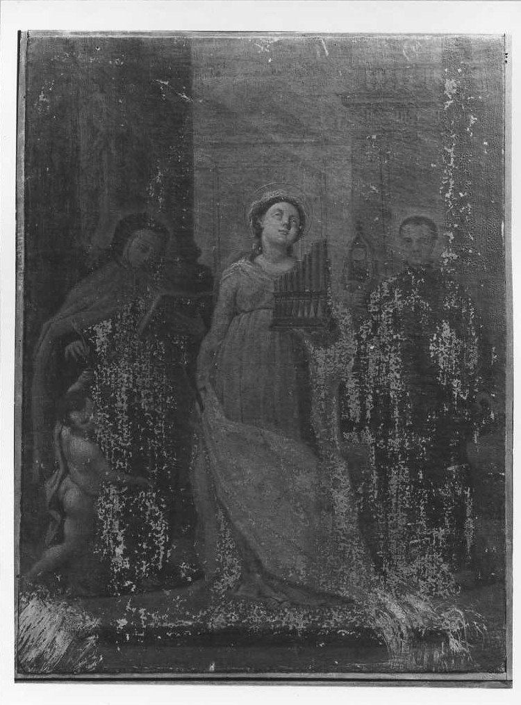 - NOTIZIE STORICO CRITICHE Il dipinto non presenta particolari tratti qualitativi. Contro uno sfondo architettonico, sta ritta con lo sguardo verso l'alto Santa Cecilia. Alla sua destra v'è Santa Teresa d'Avila, e alla sinistra un Santo non facilmente riconoscibile