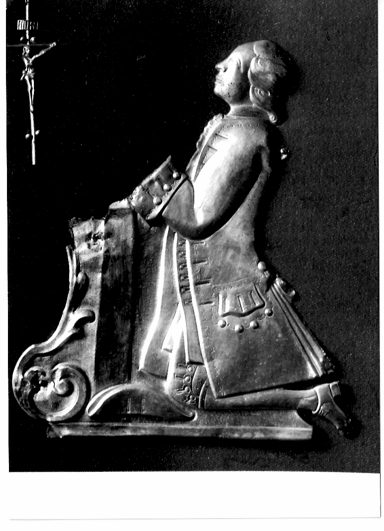 Ex voto raffigurante la sagoma di un gentiluomo in atteggiamento orante, riccamente abbigliato, genuflesso ad un inginocchiatoio decorato da ampie volute; a terra è appoggiato un tricorno