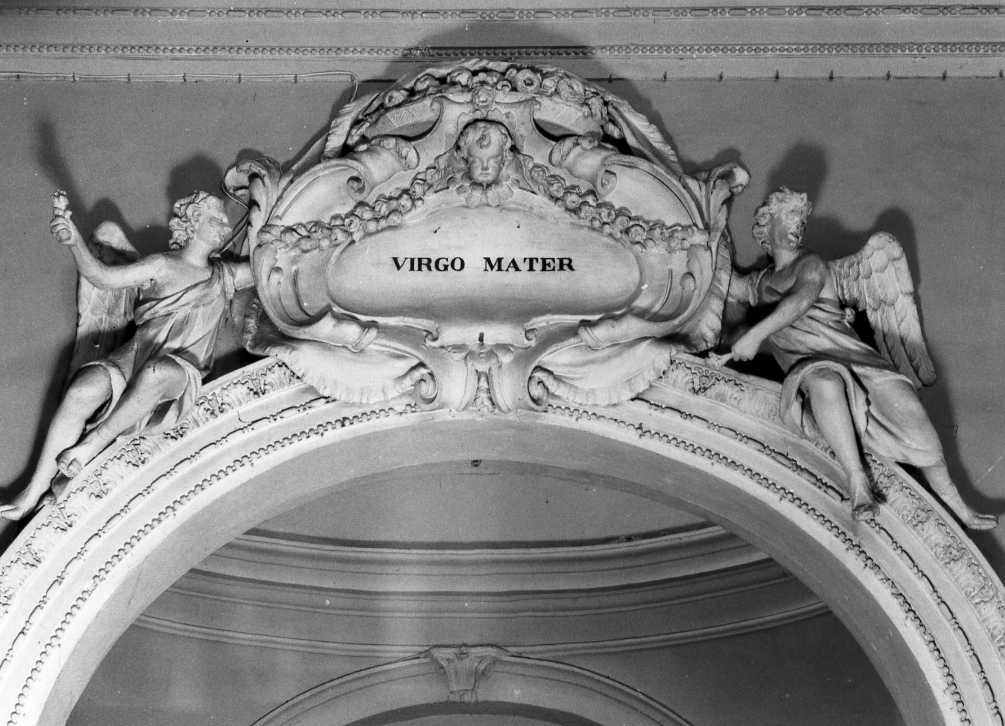 In chiave di volta, due angeli avvolti in un leggero panneggio, siedono sull'arcone d'ingresso, sostenendo una targa ornata con festoni, volute e testine angeliche