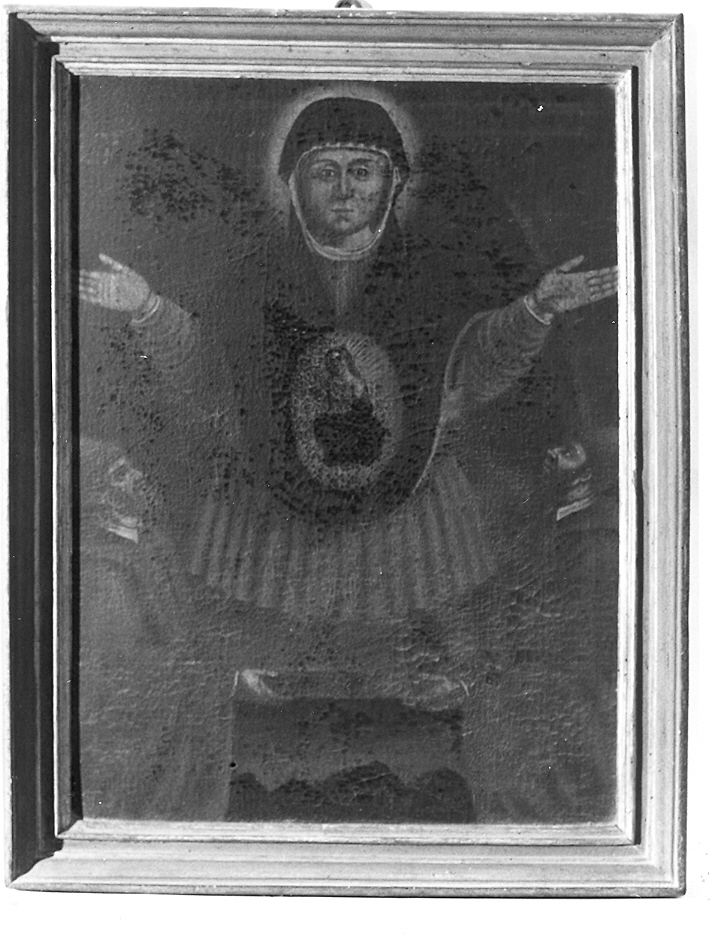 - NOTIZIE STORICO CRITICHE La Vergine, rappresentata in abiti monacali, porta in grembo il Cristo Bambino su un ovale di luce e fuoriesce da una sorta di sarcofago sostenuto da due personaggi con copricapi orientali. Il dipinto, non interessante dal punto di vista artistico, si rivela curioso da quello iconografico: il medesimo soggetto, di indubbia maggiore levatura, è riscontrabile nell'Assunta di Domenico Peruzzini, realizzata per la chiesa di San Francesco a Sant'Angelo in Vado