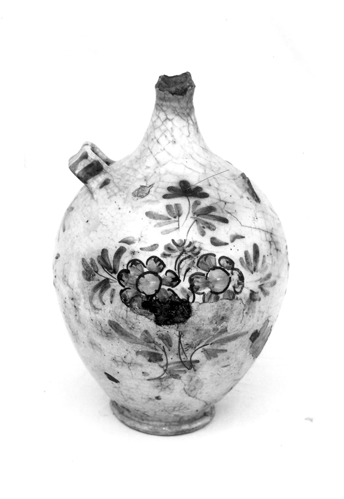 Fiasca circolare ad ampio ventre e stretto collo, con due manici nella te superiore dell'otre, alla base del collo. La decorazione, molto e, mostra due fiori stilizzati tra fogliami altrettanto stilizzati. I ri sono il verde e l'ocra sul bianco dello smalto