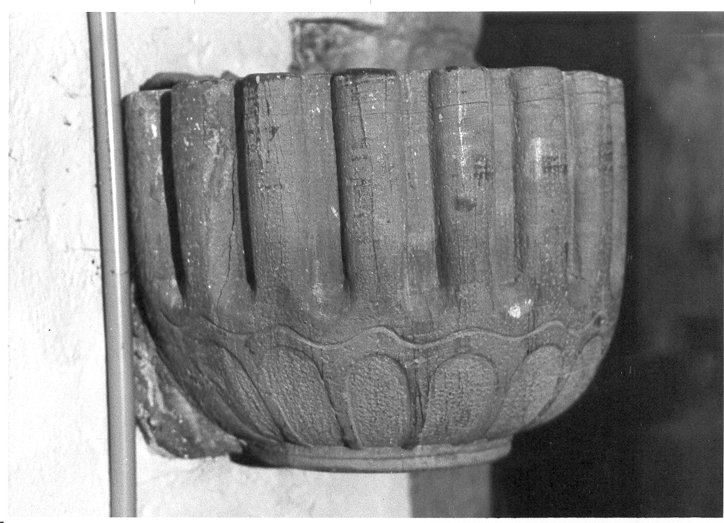 Acquasantiera formata da una vaschetta circolare, decorata sul corpo da scanalature