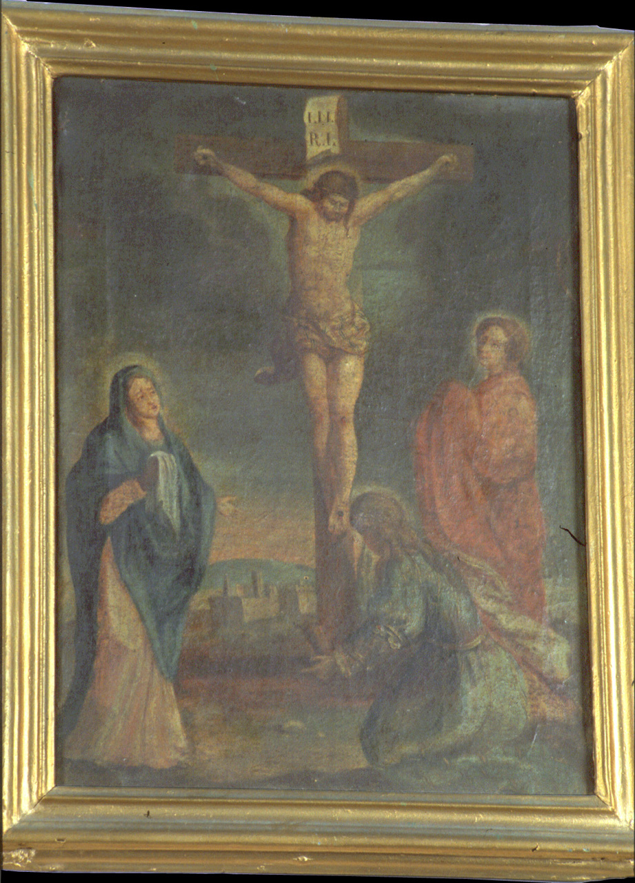 Personaggi: Madonna; Cristo; San Giovanni Evangelista; Santa Maria Maddal ena. Oggetti: croce. Paesaggi. Architetture