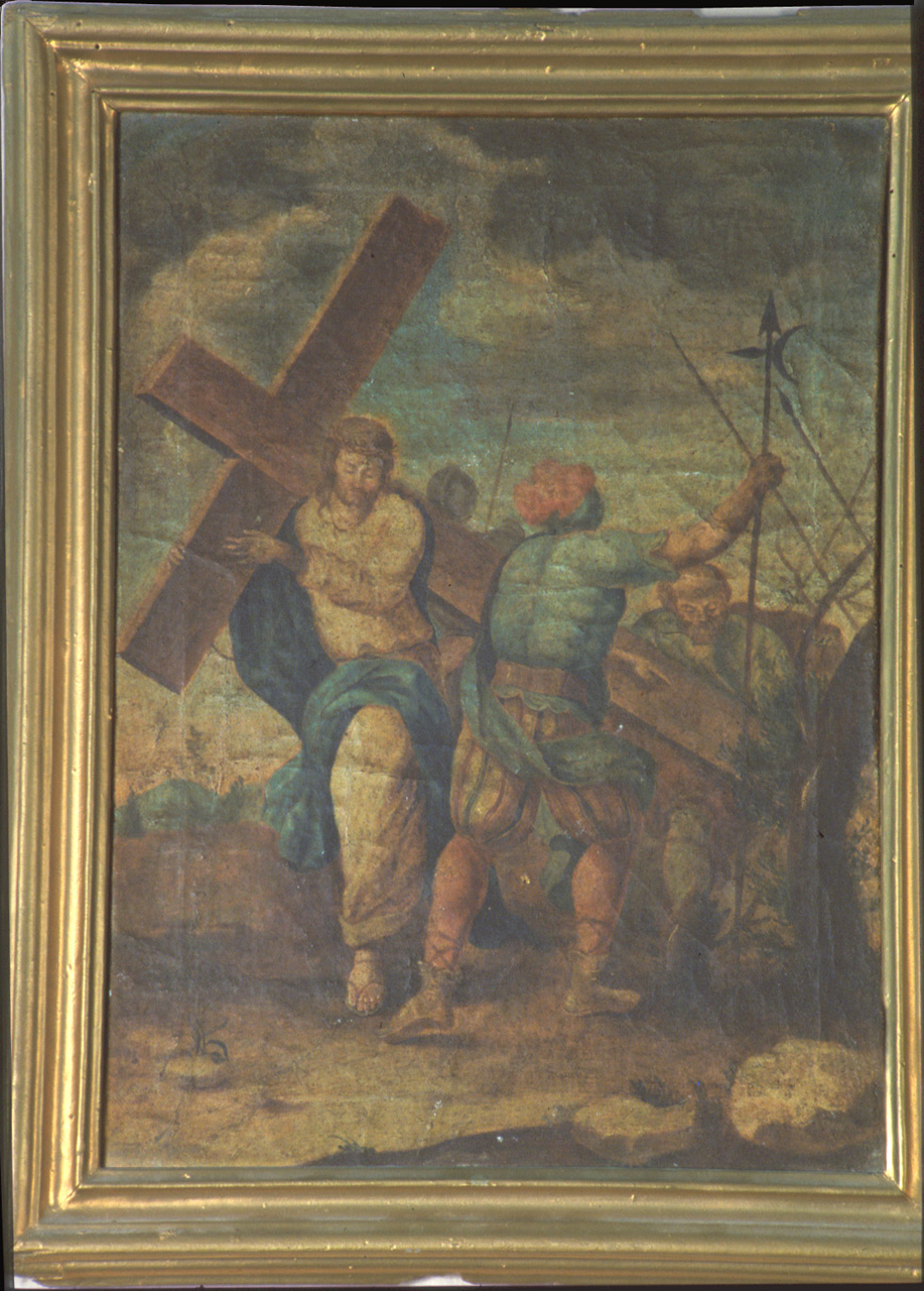 Personaggi: Cristo. Figure: carnefici; soldati. Oggetti: croce. Vegetali. Paesaggi