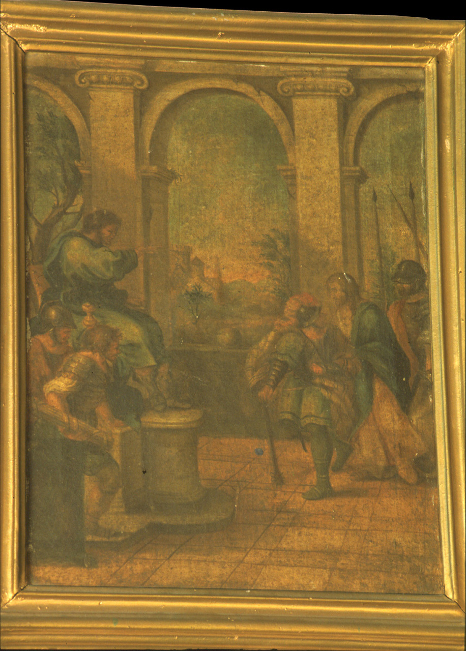 Personaggi: Cristo; Ponzio Pilato. Figure: soldati. Oggetti: trono. Architetture. Paesaggi