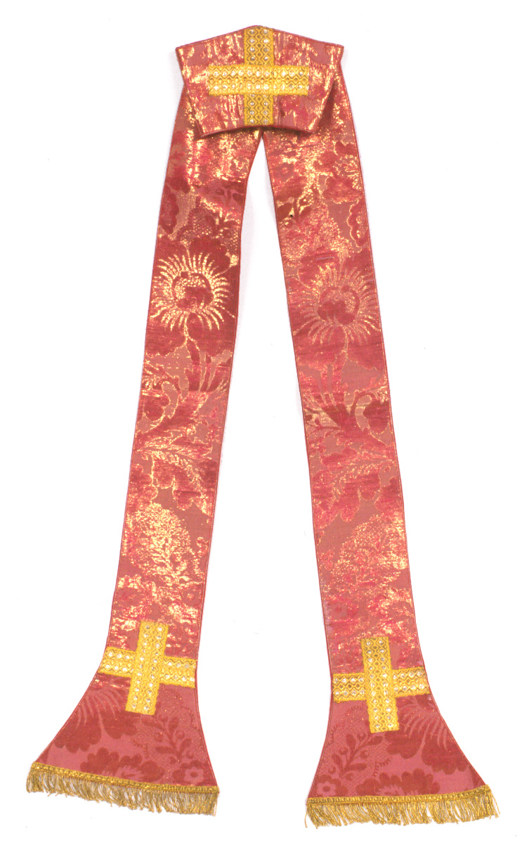 Stola in damasco gros de Tours di cotone rosso, laminato oro, con decori a pizzo e ad ampio modulo fogliaceo