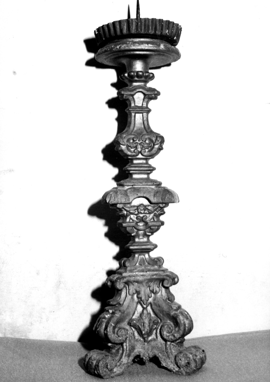 Candeliere con base a sezione triangolare, piedini a volute, foglia sul lo scudo di base, nodo modanato piccolo festone, balaustro con volute af frontate, bocciolo perlinato