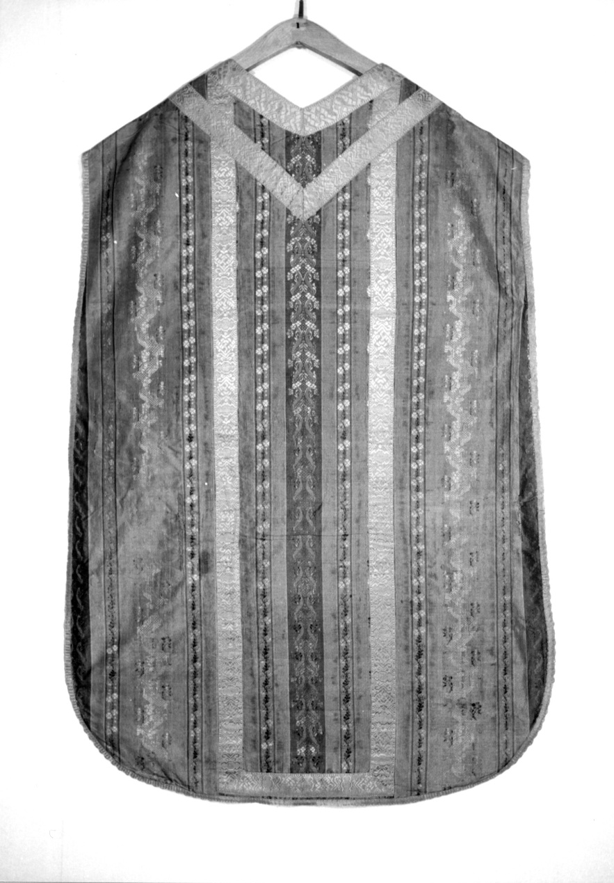 Pianeta rosa rigata a sottili bande verticali con moduli floreali alternat e a motivi a pizzo. L'opera è realizzata con sete policrome impiegate in o rditi supplementari