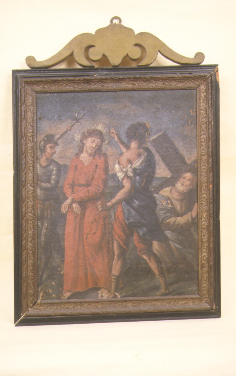 Personaggi: Gesù Cristo; Simone Cireneo. Figure: soldato; carnefice. Oggetti: croce; alabarda; corda. Paesaggi: colline con cielo