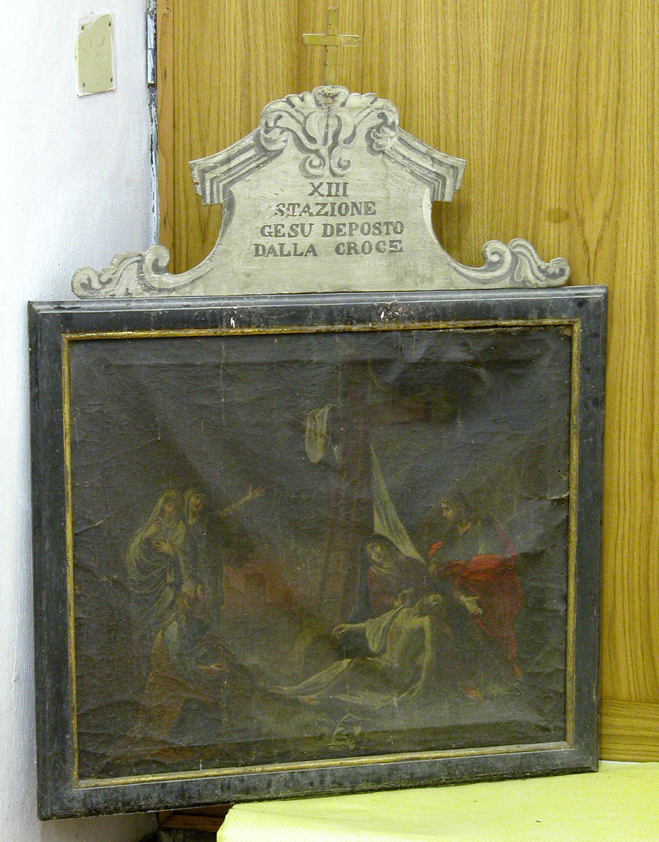 Soggetti sacri: Nuovo Testamento. Personaggi: Gesù; Madonna; San Giovanni Evangelista; Santa Maria Maddalena; Giuseppe d'Arimatrea. Figure: figura maschile. Oggetti: sudario; vasetto di aromi. Paesaggi: calvario con tre croci; tramonto rossatro
