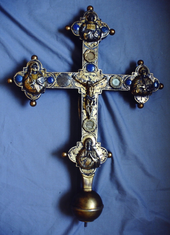 - NOTIZIE STORICO CRITICHE Il reliquiario e costituito da due faccie con al centro Cristo crocifisso e Cristo benedicente. Sui bracci sono riconoscibili la Madonna, San Giovanni, una Santa martire e un Santo frate (lato Cristo benedicente); la Madallena, S. Bartolomeo, ... (lato Crocifisso). Sul lato crocifisso uno dei medaglioni è mancante ma viene conservato in una apposita scatoletta nello stesso armadio dove è riposta la croce. Dei tre rimasti solo in uno è possibile leggere di chi sia la reliquia: S. Filippo Neri. Sul lato Cristo benedicente i tre medaglioni hanno perso la reliquia