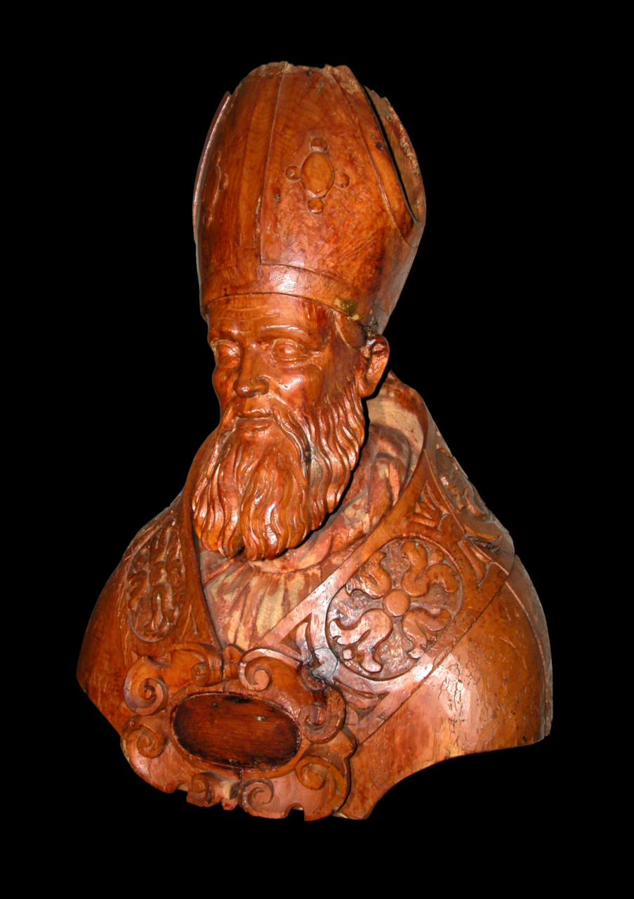 Il busto raffigura San Nicola di Mira, titolare della chiesa, in abiti vescovili: sulle spalle il piviale, con alto bordo intagliato con croci gigliate entro cornici ovali, tenuto fermo sul petto da un grosso razionale profilato da volute a doppio ricciolo. Il volto è incorniciato da una lunga barba; sul capo, la mitra. Il pezzo è lavorato in due parti, di cui quella posteriore è lasciata in parte grezza