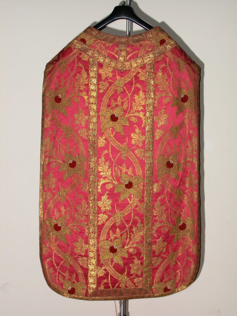 Pianeta realizzata in liseré di seta color cremisi guarnita lungo l'orlo da una banda di gallone a telaio applicato su fondo rosso scuro, raffigurante foglie vitinee disposte in modo alternato ed eseguite in oro filato.Le scansioni strutturali fra le varie parti dell'indumento sono rese con la stessa cornice dell'orlo. La colonna verticale e le parti laterali sono decorate dallo stesso motivo ma in queste ultime la decorazione si amplia adattandosi alle forme. Una composizione verticalistica strutturata da corposi tralci fioriti ricchi di foglie insieme a grappoli d'uva e a spighe di grano si intrecciano ad un sinuoso nastro sviluppato nel suo moto ascensionale.Tutte le parti ricamate sono realizzate con oro filato. Fodera in canapa color rosso