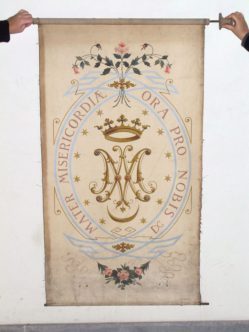 Stendardo processionale dipinto su tela di lino, con monogramma mariano circondato da motivi floreali
