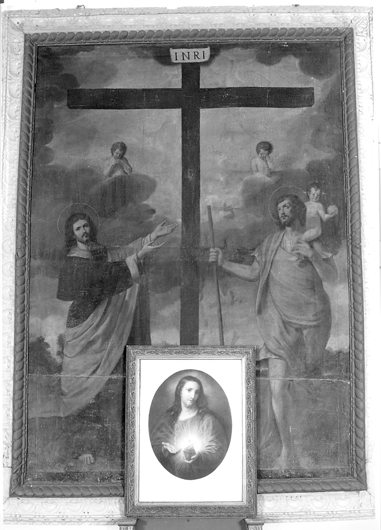 Personaggi: San Giovanni Evangelista; San Cristoforo. Attributi: (San Cristoforo) bastone; bambino. Figure: angeli. Simboli della passione: croce