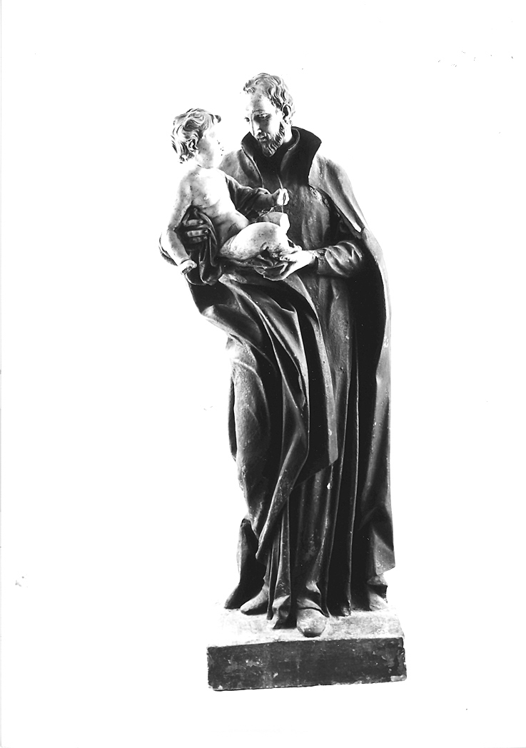 Statua raffigurante San Filippo Neri, abbigliato con tonaca e mantellina, che regge in braccio il Bambino