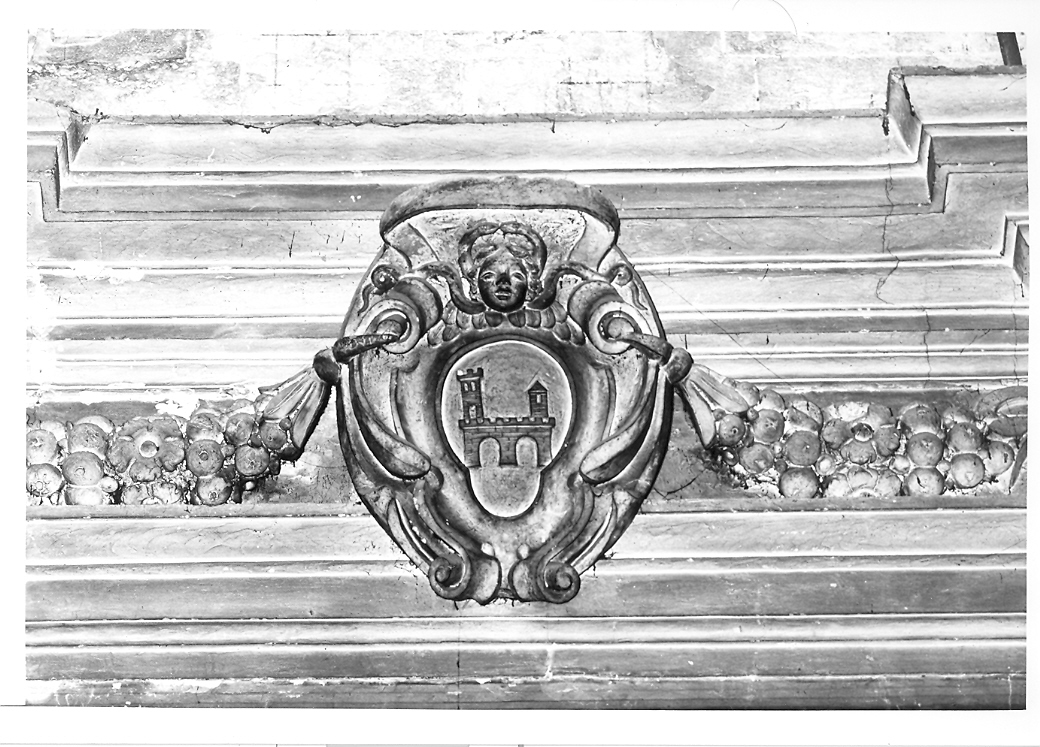 - STEMMI al centro del rilievo - comunale - Stemma - Ascoli Piceno - campo: al castello di traverso al naturale, merlato alla ghibellina, con due archi aperti e galleria sovrastante, fiancheggiata da due torri dello stesso, quella di destra merlata, l'altra a tetto