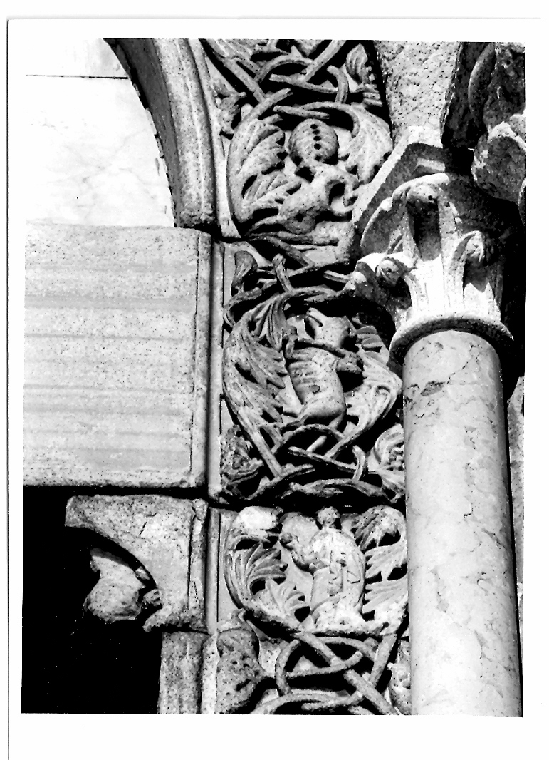 • NOTIZIE STORICO CRITICHE Il blocco che, pur fungendo d'architrave del portale, si coordina attraverso la decorazione scolpita sulle estremità laterali, all'archivolto, per il suo discreto stato sdi conservazione (dovuto evidentemente al tipo di materiale: il marmo proconnesio), permette di apprezzare la raffinata qualità degli ornati vegetali e animali riprodotti con vivo senso naturalistico e con minuta cura di ogni dettaglio. Sono queste le figure di volpi che avevano suggerito la possibilità d'interpretare l'intera composizione come una metafora della Volpe e L'Uva. La possibilità che l'archivolto in questione sia contemporaneo agli altri, viene indicata da un confronto con alcune figure animali scolpite sul quarto