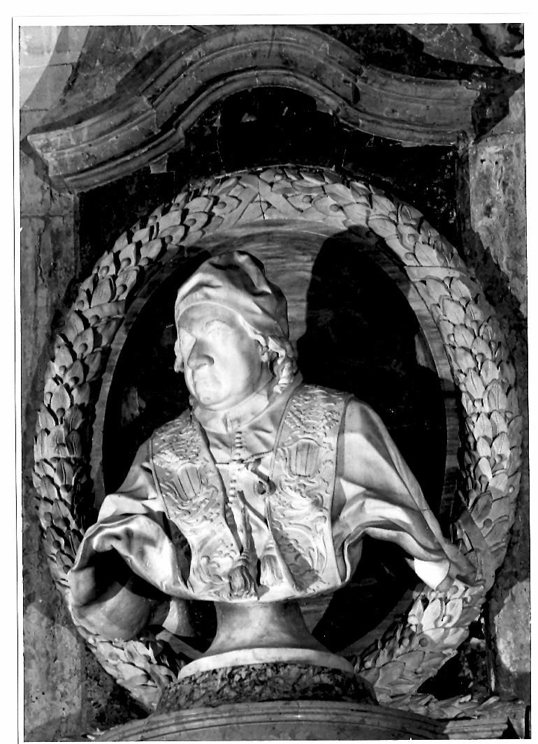 - NOTIZIE STORICO CRITICHE Tradizionalmente attribuito dagli storici locali a scultore di ambito romano, il busto del papa, come l'angelo dell'altro monumento, evoca di fatto i modi di artisti di ambito capitolino, primo tra i quali Pietro Bacci al quale si deve peraltro il grande monumento dedicato al medesimo pontefice nella Basilica Vaticana (1759). Si rileva una medesima morbida e chiaroscurata plasticità e un attento intento ritrattistico risolto con eleganza