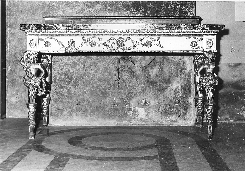Tavoli da muro con gambe scolpite, intagliate e dorate con motivi tortili, telamoni e racemi firomorfi. Piana di marmo venato