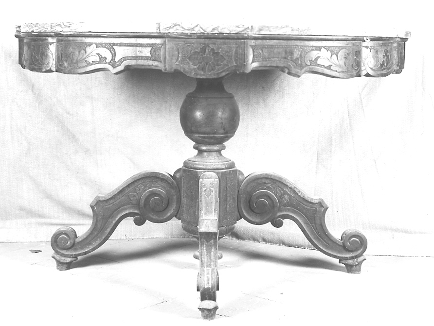 Quattro montanti a voluta con terminazione a ricciolo; stelo ovaliforme; piano circolare mistilineo, ornato lungo il bordo da motivi foliari, appena incisi