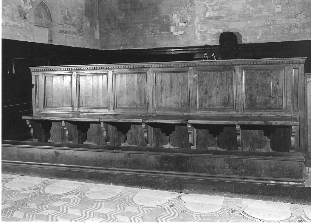- NOTIZIE STORICO CRITICHE I bancali del coro, in noce chiaro, presentano una struttura molto semplice e ben costruita. Possono quindi essere ricollegati alla produzione lignea artigianale delle Marche del XVII secolo, di cui la Cattedrale di Osimo conserva numerosi e pregevoli esemplari