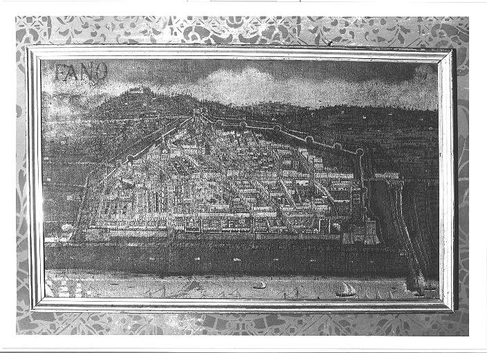 Paesaggi: città di Fano; orti; mura; casette coloniche; alberata di Monte Giove. Figure: pedoni. Mezzi di trasporto: carrozze; battelli; velieri