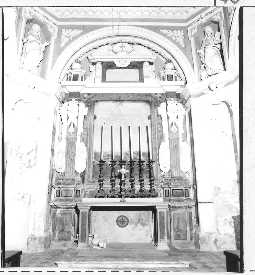 Altare entro nicchia delineata da arco, vi si accede da gradino; ha la mensa retta da paraste laterali con specchi color terra di Siena, come quelle che delineano l'ornato, su piedistalli grigio variegati, e la cornice. Decorazione a triplice testa di angioletto vista di fronte e di profilo che prosegue in doppio motivo a valva di conchiglia, emerge nelle paraste laterali. La cornice d'imposta superiore, di stucco bianco, regge il timpano, tra due vasi infiammati su basi squadrate, contraddistinto da cartella centrale con angioletti e da motivo a valva di conchiglia tra due volute