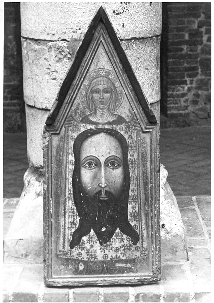 Nella cuspide della tavola S. Veronica, con un nimbo decorato a motivi floreali, regge il volto Santo impresso in un panno damascato con i lembi piegati