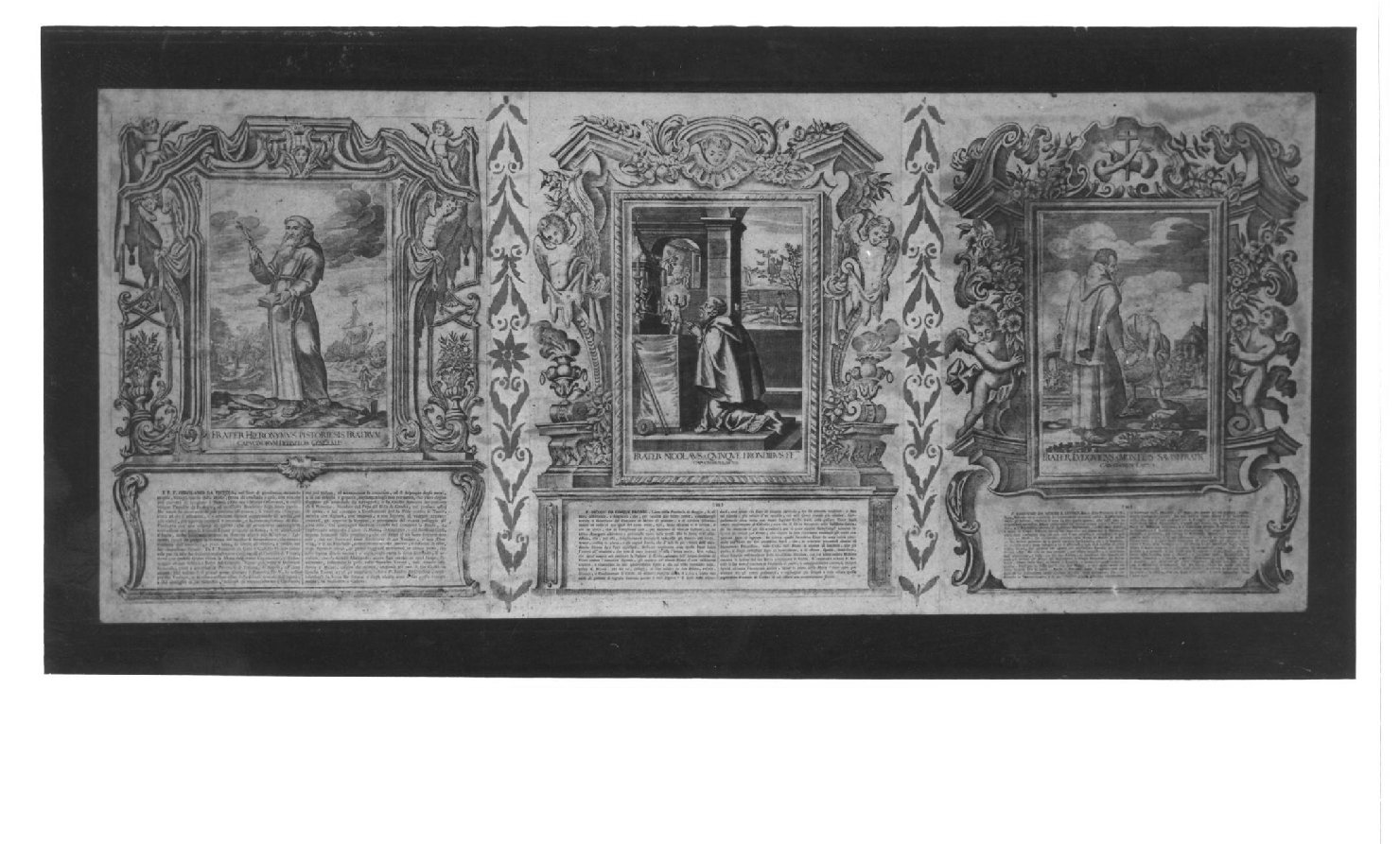 • NOTIZIE STORICO CRITICHE La stampa costituisce la prima dell'opera "Flores Seraphici...Capuccinorum" che consiste in una collezione di stampe raffiguranti i Cappuccini più illustri dal 1525 al 1612, denominata Flores Seraphici, opera del cappuccino Carlo d’Aremberg che si avvalse degli incisori fiamminghi Löffler, attivi a Colonia intorno alla metà del secolo XVII. Il maggiore, Johann Eckhard fu attivo dal 1630 al 1675; il minore Johann Heindrich