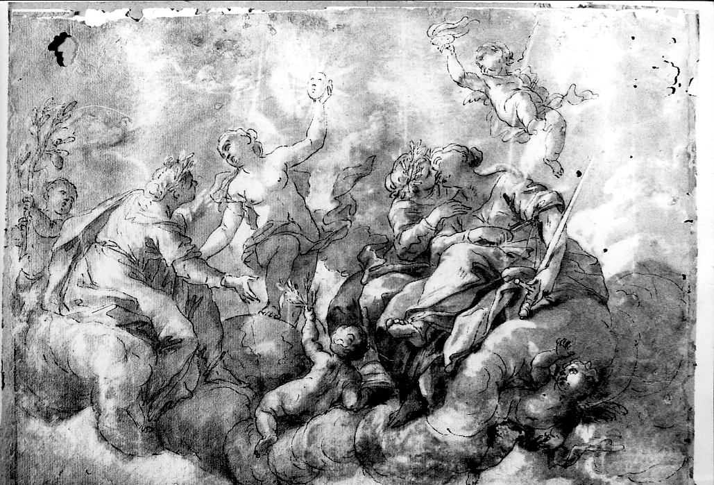 - NOTIZIE STORICO CRITICHE Si occupoò per la prima volta del foglio il prof. Bigiaretti che lo attribuì al Padre Pozzi; in seguito Anna Forlani Tempesti lo avvicna al bolognese Marcantonio Franceschini con puntuali confronti con i suoi disegni sicuri: per esempio quello degli Uffizi 20305 F con Allegoria, il 4537 S con una Santa e il 4558 con l'Eterno e angeli o ancora quello del Louvre 8226 con Studio di soffitto con figure mitologiche. La studiosa ritiene che anche quello in esame si tratti di uno studio per la decorazione di un soffitto, vicini a quelli per la chiesa del Corpus Domini di Bologna eseguiti fra il 1689 e il 1696 (D. Miller, Important Drawings by Marcantoni Franceschini of Cooper Union, in "The Art Bullettin ", giugno 1961, p. 133)