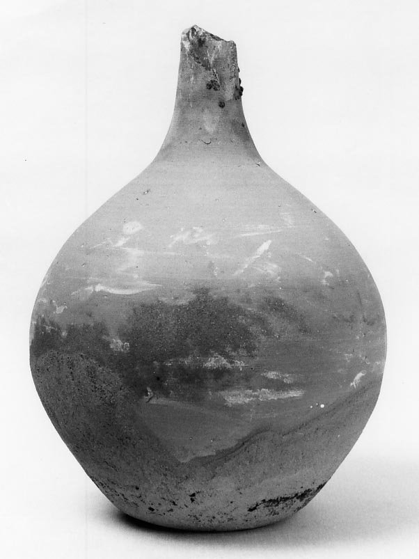 MC/11. Fiasca dal corpo panciuto, collo non alto, bocca a cordone. Superfi cie rossa scabra; appoggio dai bordi arrotondati. Molte incrostazioni calc aree e macchie per conservazione in ambiente umido