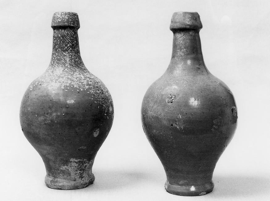 - NOTIZIE STORICO CRITICHE La forma delle bottiglie, la verniciatura appartengono a prodotti dell'Eur opa Settentrionale, in particolare della Germania e della Renania. Confron ti si hanno con bottiglie simili trovate in Inghilterra provenienti dalla Germania fra la fine del Settecento e gli inizi dell'Ottocento. Evidenteme nte servivano per esportare dei liquidi. Purtroppo nessuna delle 12 bottig lie contiene materiale