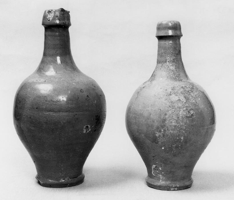 - NOTIZIE STORICO CRITICHE La forma delle bottiglie, la verniciatura appartengono a prodotti dell'Eur opa Settentrionale, in particolare della Germania e della Renania. Confron ti si hanno con bottiglie simili trovate in Inghilterra provenienti dalla Germania fra la fine del Settecento e gli inizi dell'Ottocento. Evidenteme nte servivano per esportare dei liquidi. Purtroppo nessuna delle 12 bottig lie contiene materiale