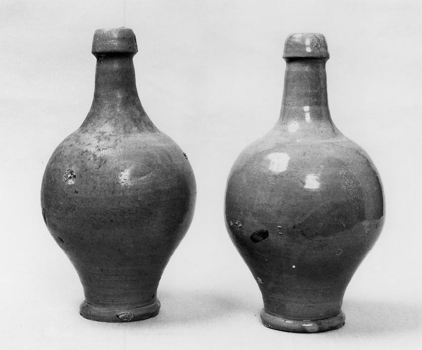 - NOTIZIE STORICO CRITICHE La forma delle bottiglie, la verniciatura appartengono a prodotti dell'Eur opa Settentrionale, in particolare della Germania e della Renania. Confron ti si hanno con bottiglie simili trovate in Inghilterra provenienti dalla Germania fra la fine del Settecento e gli inizi dell'Ottocento. Evidenteme nte servivano per esportare dei liquidi. Purtroppo nessuna delle 12 bottig lie contiene materiale