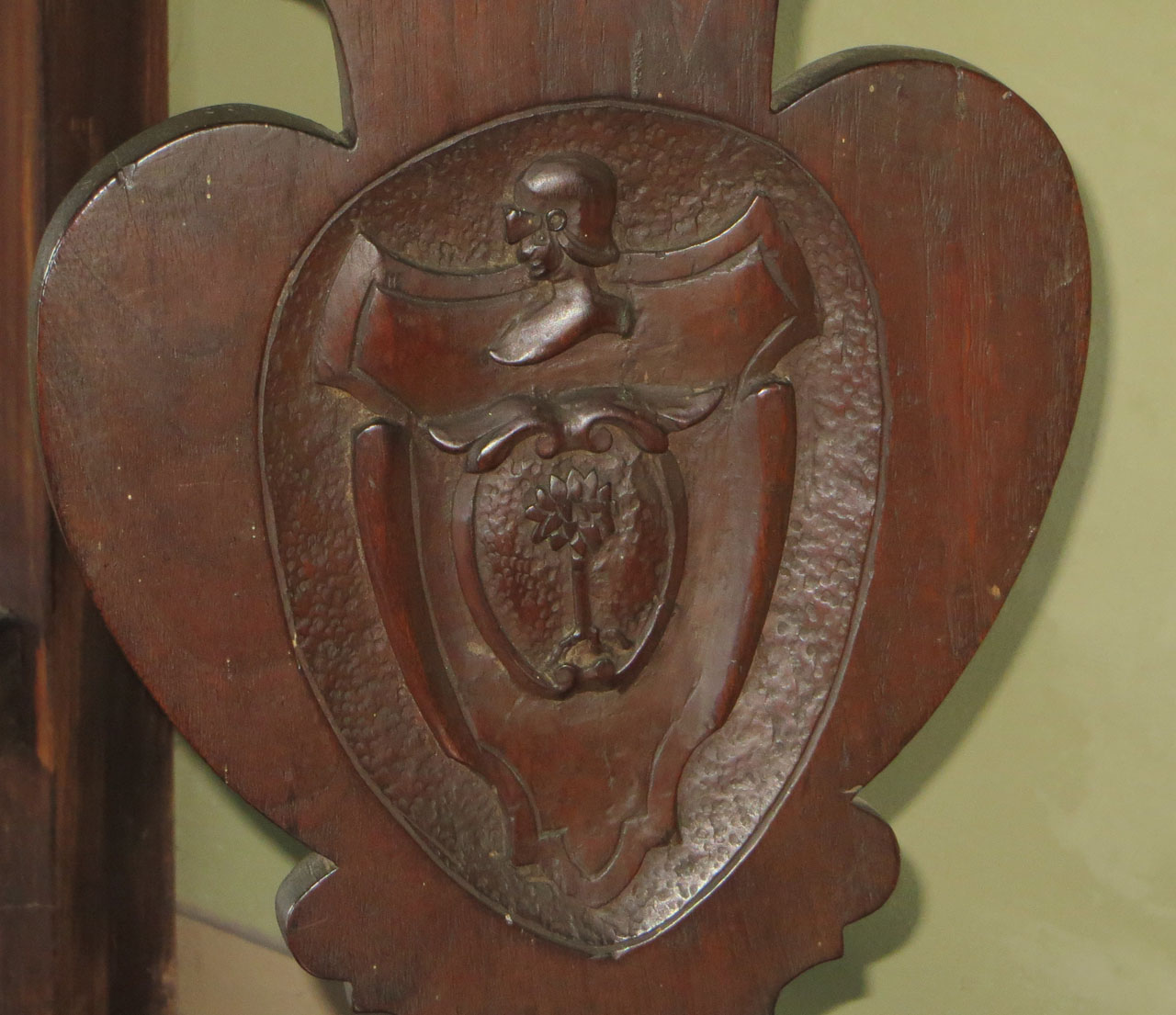 - STEMMI schienale - gentilizio - Emblema - 1 - Scudo con all'interno una rovere e cimiero nella fascia superiore