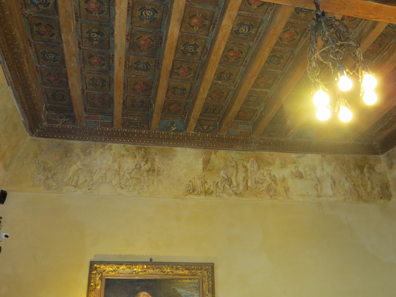 Ciclo di pitture murali disposte sulle pareti della sala lungo una fascia perimetrale al soffitto