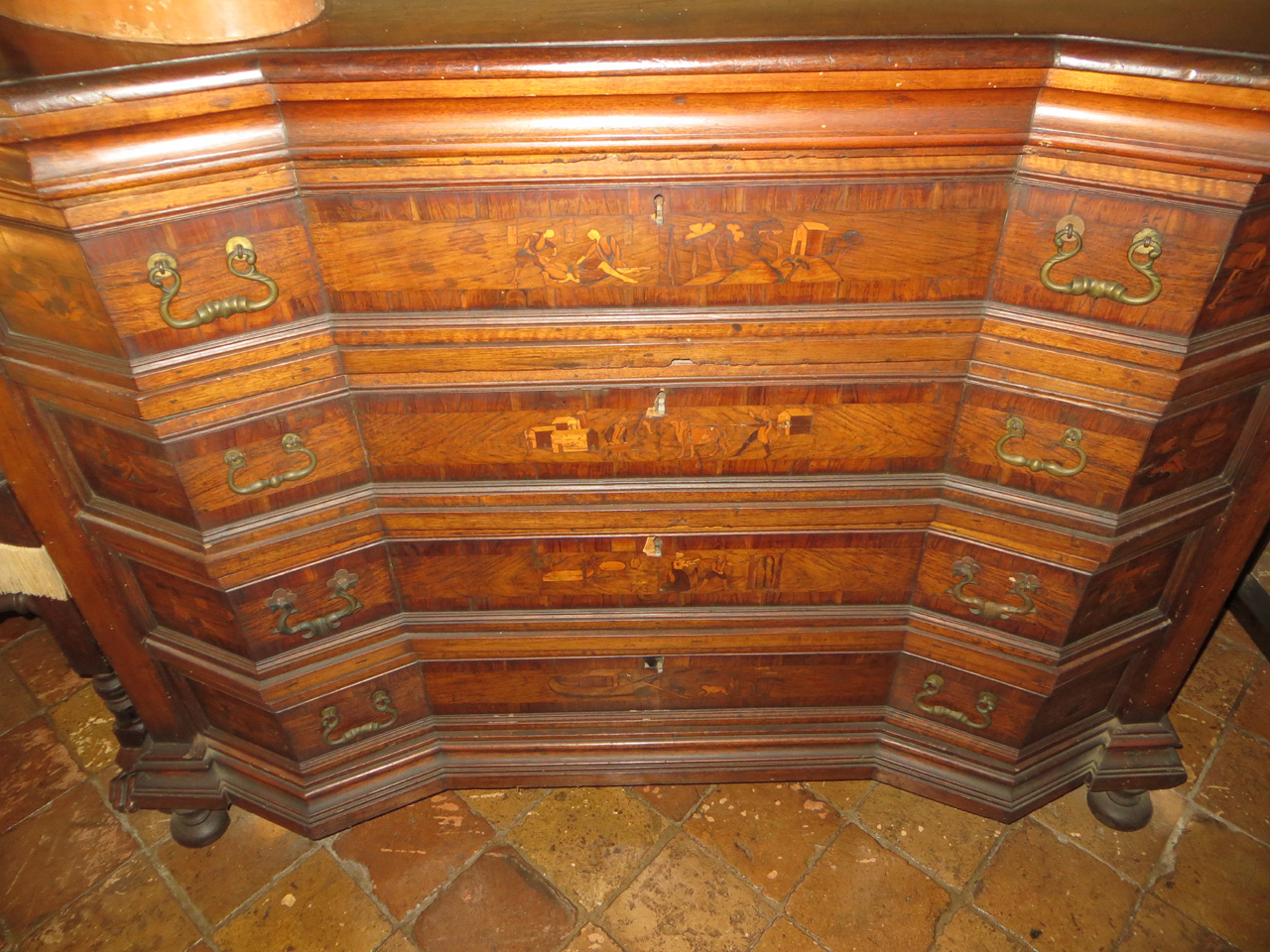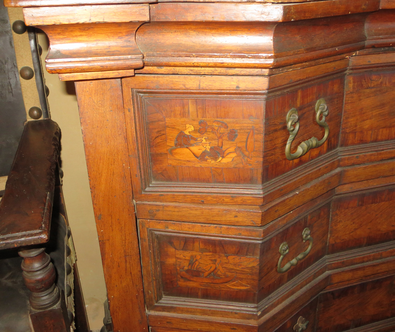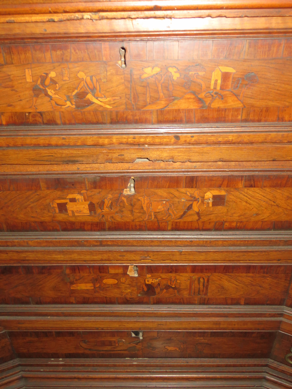 Comò in legno intarsiato con base modanata poggiante su piedi a rocchetto e quattro cassetti di eguale altezza. Sul fronte di ciascun cassetto, sia lateralmente che al centro, è presente una decorazione a intarsio con scenette popolate da figurine maschili, femminili, animali e paesaggi