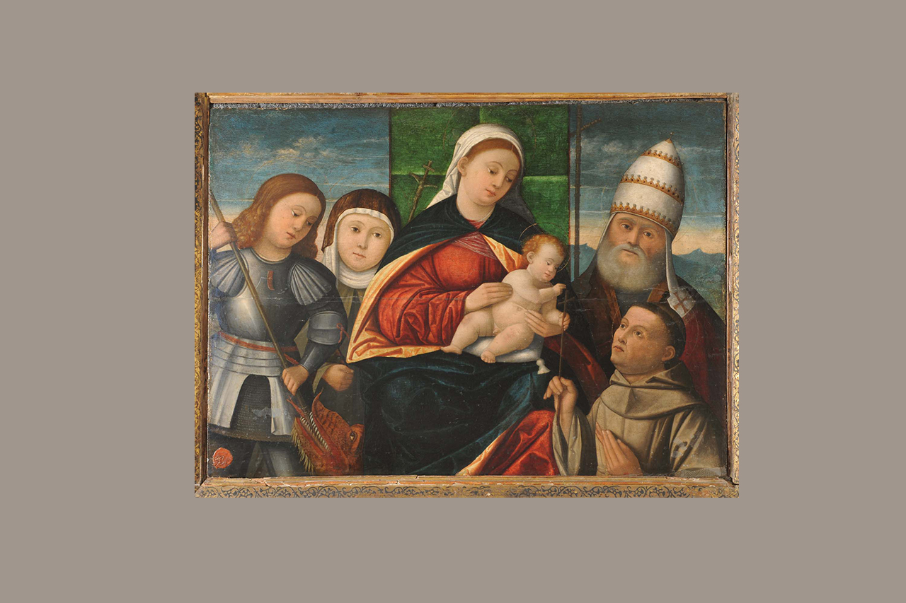 - NOTIZIE STORICO CRITICHE Il dipinto raffigura la Madonna con il Bambino assisa in trono tra santi. A sinistra è possibile riconoscere San Giorgio, rappresentato mentre affonda la sua lancia nella testa del drago; dietro di lui, Santa Chiara volge lo sguardo meditabondo all'osservatore, come il santo pontefice, forse san Gregorio Magno, disposto specularmente al fianco della Vergine. In primo piano è san Francesco che porge una lunga ed esile croce al Bambino, il quale la prende rivolgendogli un gesto benedicente. Sullo sfondo si coglie un accenno di paesaggio collinare montano, sul quale si apre il bagliore di una nuova alba, simbolo della rinascita della religione rappresentata sia dalla figura del giovane Cristo che dai santi riformatori raffigurati nell’opera. Il dipinto, attribuito alla maniera dei Santacroce da Luigi Serra (Serra 1919, p. 64; Serra 1930, p. 104), è ritenuto da Heinemann (Heinemann 1962, p. 155) di Francesco Rizzo da Santacroce, detto Rizzo De Vecchi (De Galizzi), mentre Dal Poggetto lo assegna a Girolamo da Santacroce (Dal Poggetto 2003, p. 113). La modesta qualità dell’opera conduce la critica ad assegnarlo piuttosto alla bottega del primo. Allievo di Francesco di Simone da Santacroce, Rizzo da Santacroce apparteneva ad un gruppo di pittori di origine bergamasca attivi a Venezia tra il XV e il XVI secolo e operanti in due diverse botteghe (Della Chiesa 1975, p. 489). In origine l’opera era conservata nel convento di Santa Chiara ad Urbino, luogo dove Elisabetta Gonzaga trascorse gli ultimi anni di vita dopo la morte del marito e l'ascesa al ducato del figlio adottivo, Francesco Maria della Rovere. L’iscrizione “Elisabeth Gonzaga Urbini Ducisse” sulla cornice coeva al dipinto suggerisce verosimilmente che lo stesso rappresentò un dono al Convento ad opera della Duchessa