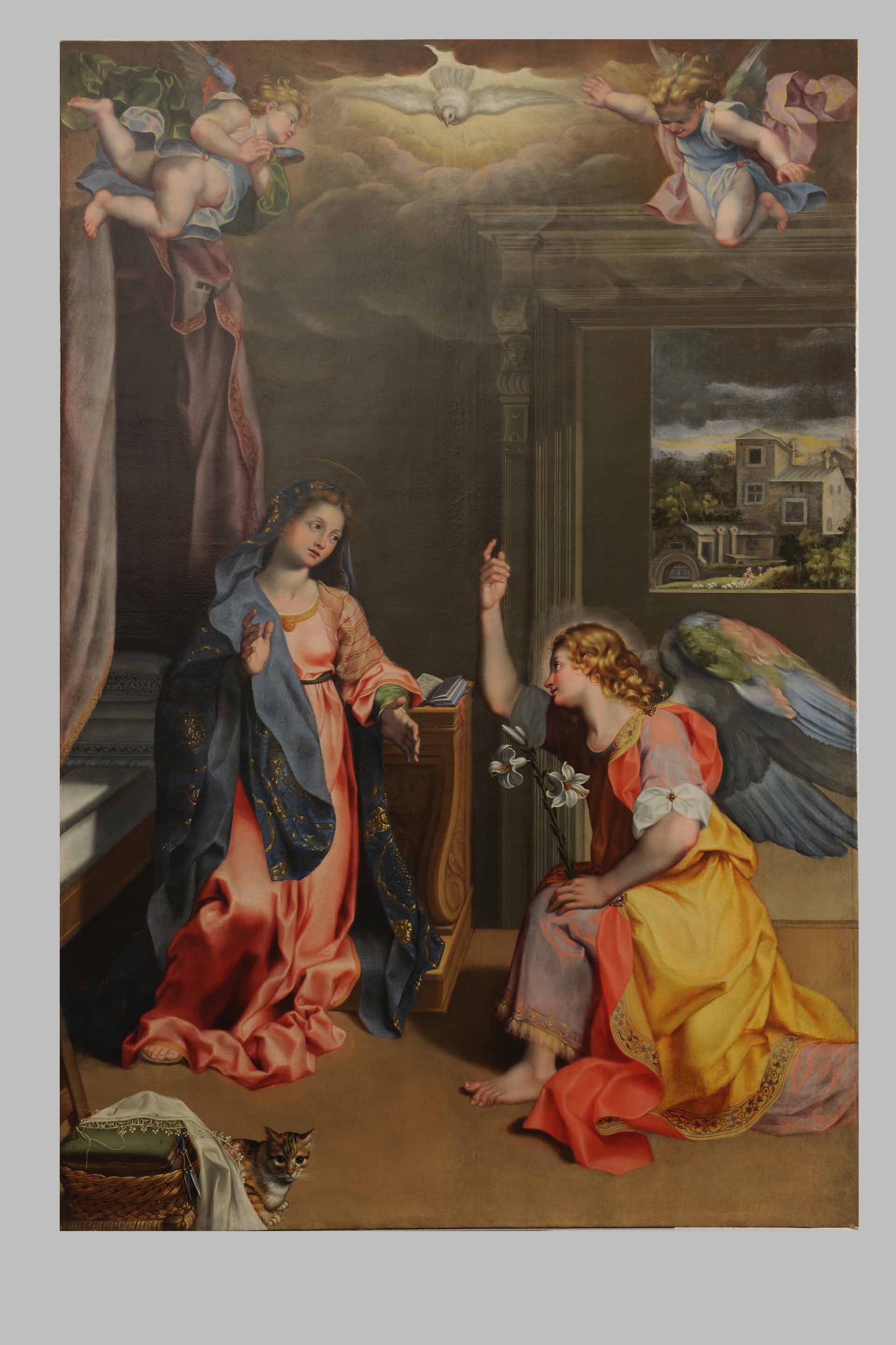 - NOTIZIE STORICO CRITICHE Il dipinto proviene dalla chiesa urbinate dell'Annunziata degli Scalzi, soppressa, ed il quadro arriva nelle collezioni di Palazzo Ducale nel 1864. Attribuito inizialmente ad Alessandro Vitali, il dipinto risulta invece più tardo e meno raffinato. Infatti è carico di una certa pomposità che poco si addiceva al Vitali, allievo del Barocci. La qualità bassa del dipinto fa pensare ad uno scopo prettamente devozionale